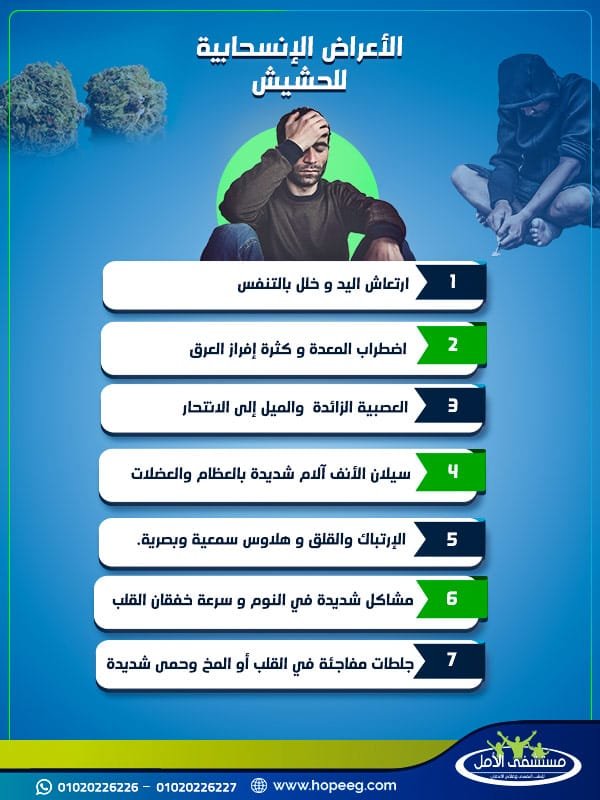 بعد التوقف عن الحشيش عليك التوجه إلى مؤسسة الأمل حتى تستطيع التخلص من الأعراض الانسحابية التي قد تكون سببًا في انتكاستك مرة أخرى، وحتى أيضًا تخضع لبرنامج علاجي نفسي متكامل يعالج جميع الاضطرابات النفسية والسلوكية المرتبطة بإدمان الحشيش.