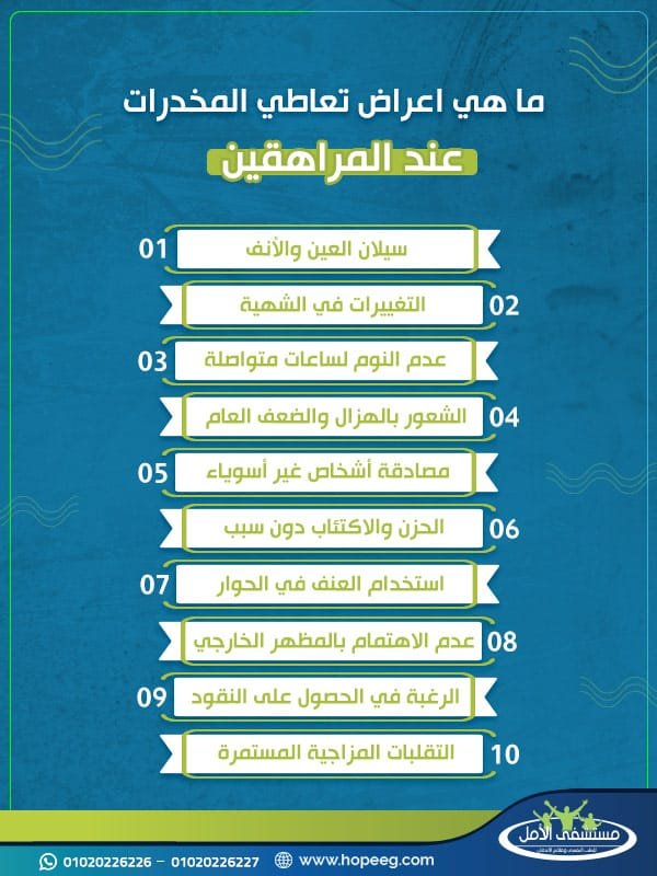 تظهر اعراض تعاطي المخدرات عند المراهقين، عادة في بداية استخدامهم للمخدر، بعض العلامات السلوكية الآتية:-
